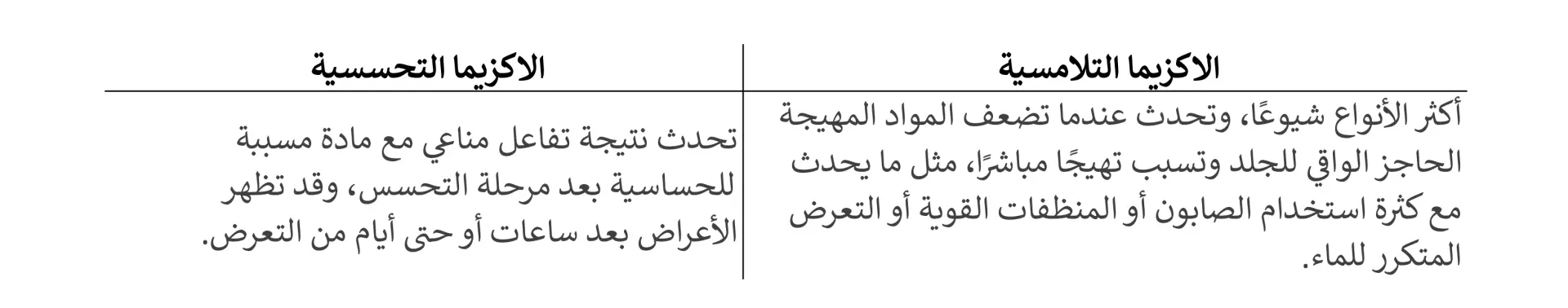 - الأكزيما التلامسية المهيجة: تنتج عن ملامسة مواد تضعف أو تؤذي الطبقة الخارجية للجلد، مثل: المنظفات القوية أو المواد الكيميائية.