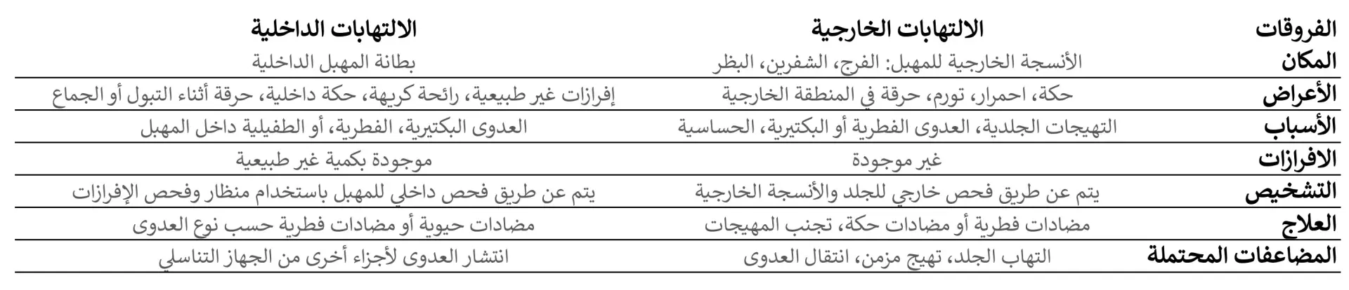 يشير الجدول التالي إلى أهم الفروقات ما بين الالتهاب الخارجي والتهاب المهبل الداخلي: