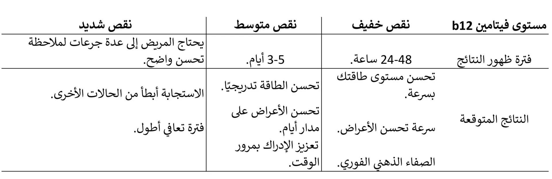 تختلف نتائج ابر b12 على الجسم وفقًا لشدة النقص في فيتامين b12، وذلك كما يلي.